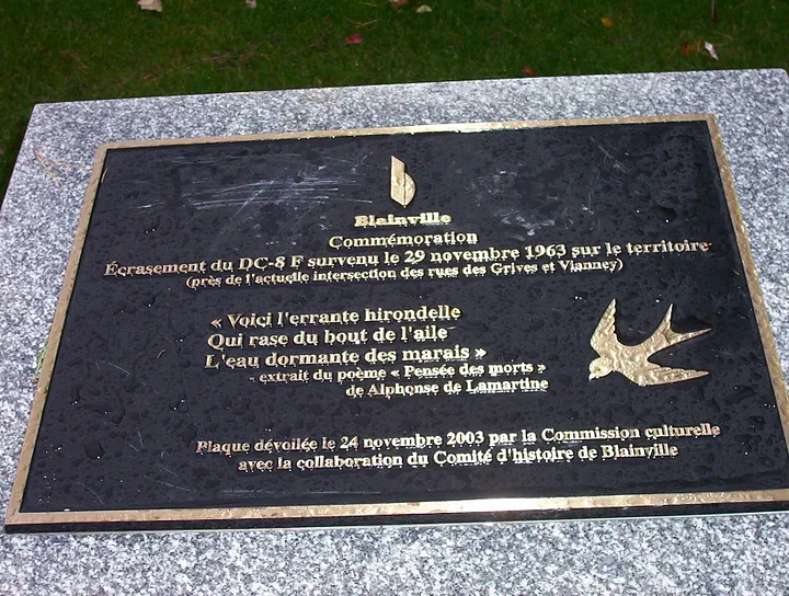 Acidente com um DC-8F ocorrido em 29 de novembro de 1963 nesta propriedade (próximo ao atual cruzamento da Rue des Grives com a Rue Vianney).