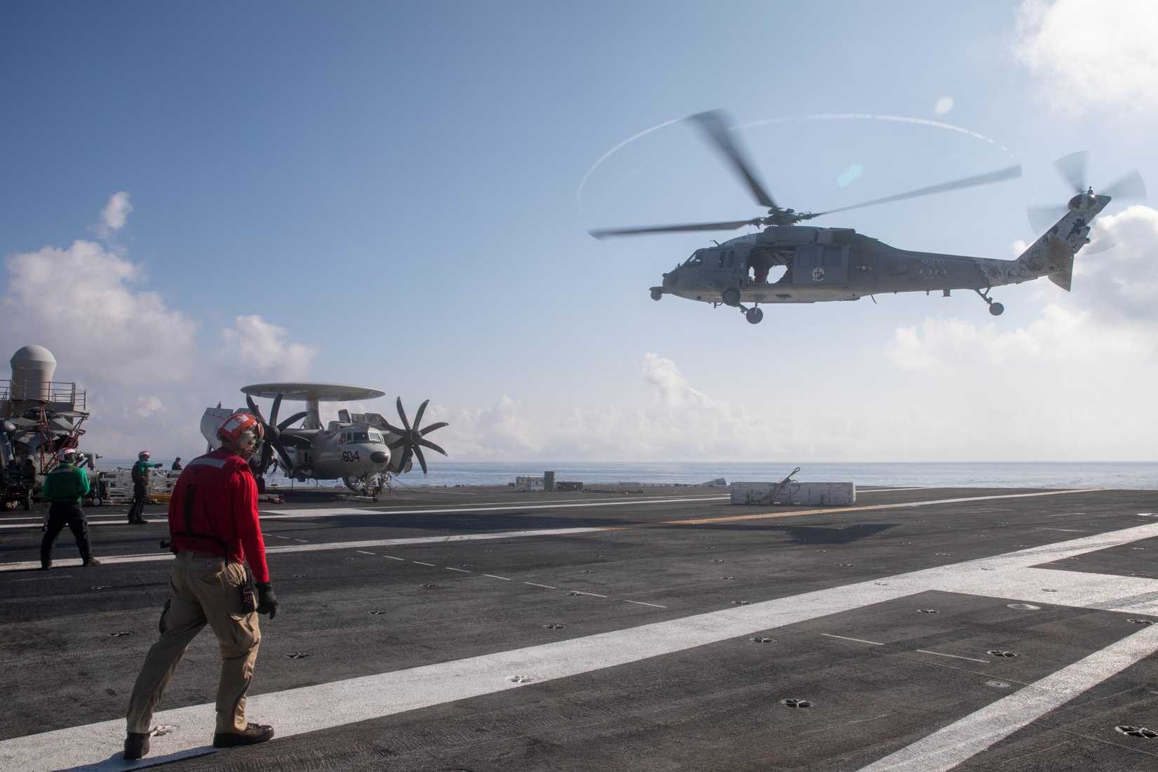 | Um helicóptero MH-60S Sea Hawk da Ala Aérea Embarcada 8, pertencente ao Esquadrão de Helicópteros de Combate Marítimo (Crédito: Marinha dos EUA) |