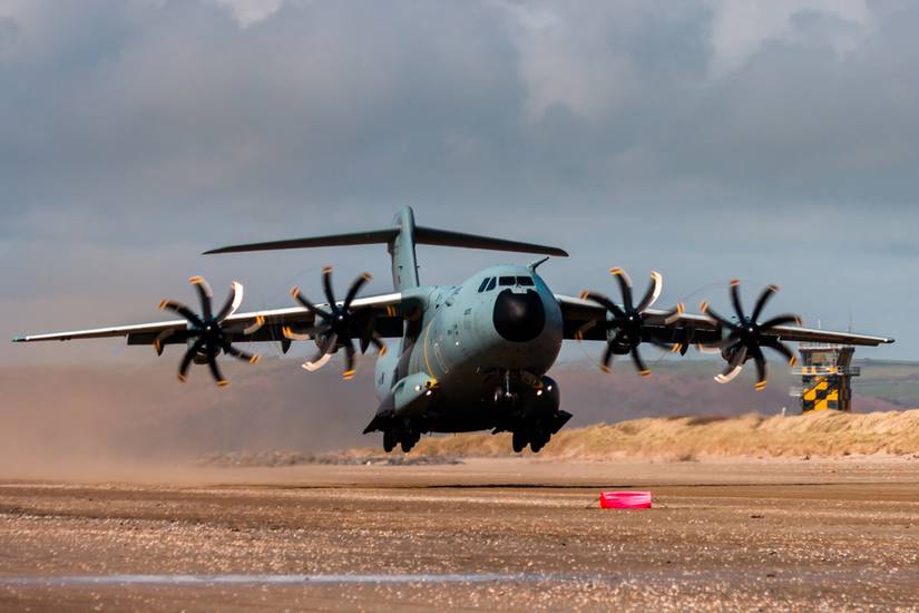 | Um avião de transporte militar Airbus A400M 'Atlas' da Força Aérea Real Britânica praticando pousos táticos (Crédito: Shutterstock) |