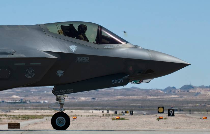 | Um F-35A Lightning II aguarda para decolar na Base Aérea de Nellis, Nevada (Crédito: Departamento de Defesa dos EUA) |