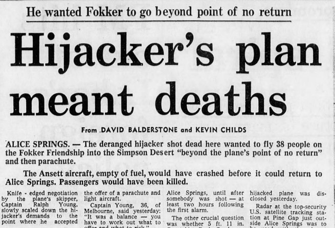 Eram 13h40, cerca de meia hora antes do horário programado de pouso, quando o voo estava descendo para o aeroporto de Alice Springs, o sequestrador saiu do banheiro, sacou a arma e disse a um comissário de bordo chamado Gai Rennie: "Isso é um sequestro".