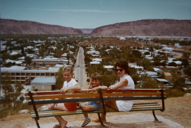 | Foto de família: Sharon, Peter e Beth Young em Alice Springs logo após o sequestro |