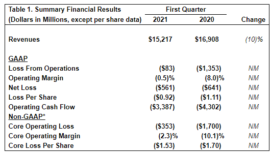 A Boeing divulgou os resultados financeiros referentes ao primeiro trimestre de 2021, com uma receita de US$ 15,2 bilhões, queda de 10% em relação ao mesmo período do ano anterior, influenciada principalmente por um número menor de entregas do B787 e do próprio volume de serviços comerciais, mas parcialmente compensado por mais entregas do B737 MAX.