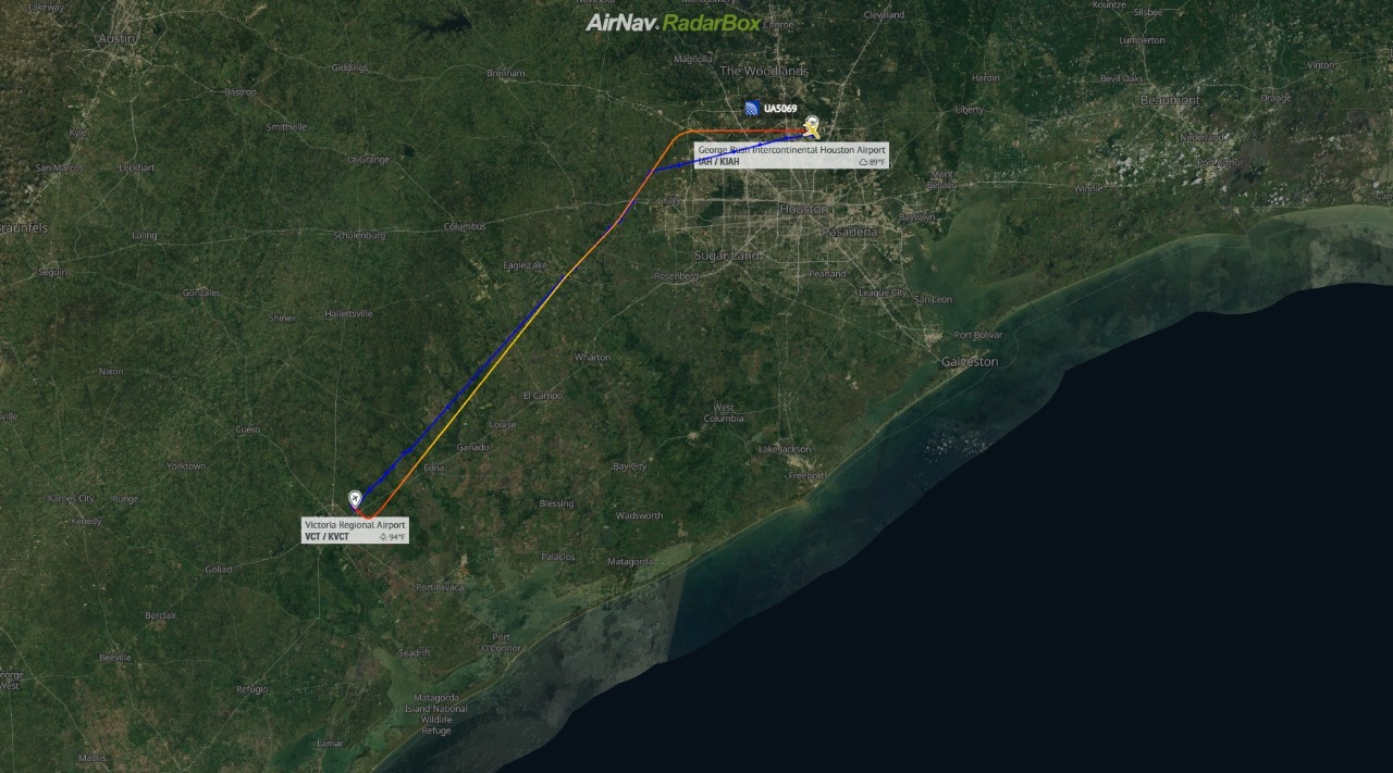 A aeronave realizava o voo UA-5069 de Victoria, no Texas, para Houston Intercontinental. Veja a rota no gráfico abaixo produzido pelo aplicativo de monitoramento AirNav RadarBox.