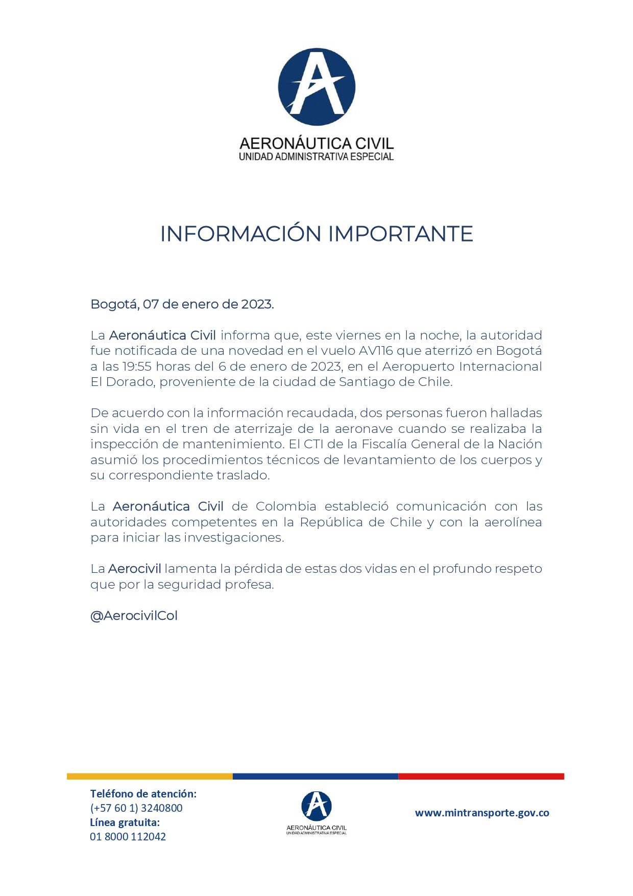 Dois corpos foram encontrados no trem de pouso do avião Airbus A320-251N, prefixo N765AV, da Avianca, que passava por manutenção na capital da Colômbia, informou a companhia aérea neste sábado (7).