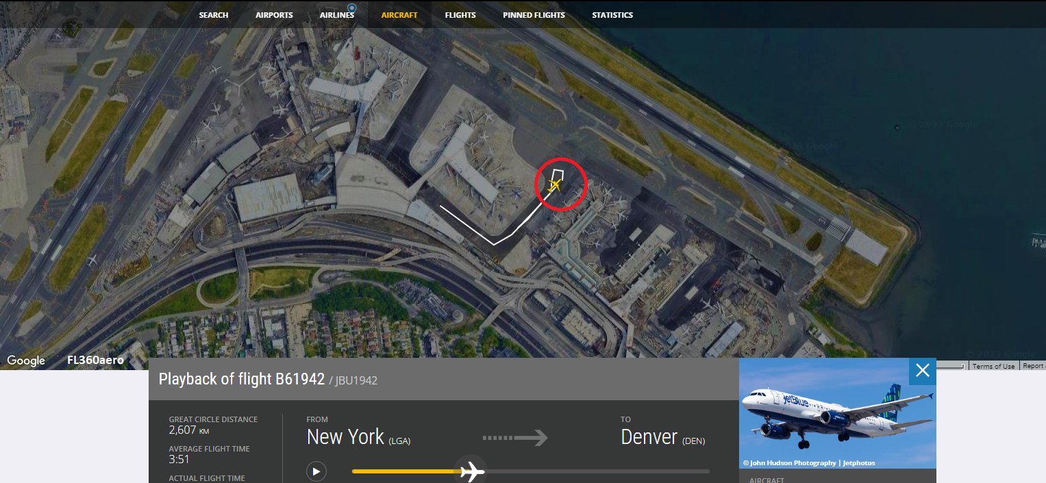 A aeronave Airbus A320-232, prefixo (N568JB, da JetBlue, construída em 2003, parou na pista de táxi enquanto taxiava para o voo B61942 para Denver, devido à descarga de combustível da asa direita no Aeroporto LaGuardia de Nova York nesta quarta-feira 18 de janeiro.