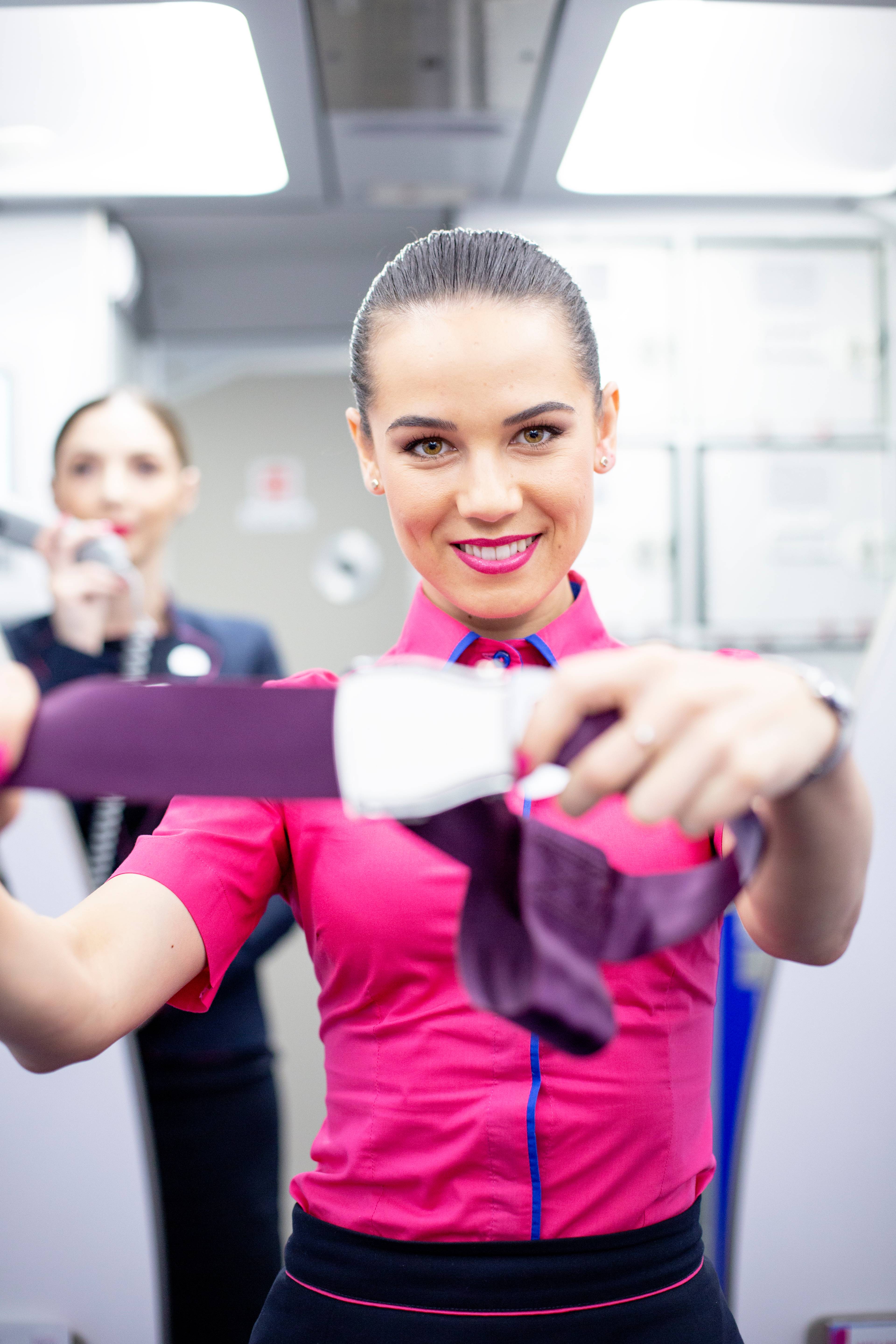 Uma tripulante de cabine da Wizz Air fornece uma demonstração de segurança (Foto: Wizz Air)