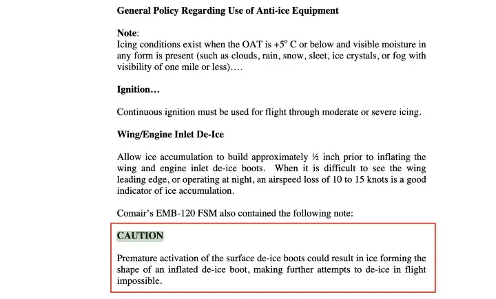 Como se viu, no entanto, esse não foi o caso. Na verdade, o FSM da Comair instruiu especificamente os pilotos a esperar até que pelo menos 1,27 cm (½ polegada) de gelo se acumulasse nas asas antes de ligar as botas de degelo de ponta. A razão para esta regra foi explicada naquela mesma página, com um cabeçalho em letras maiúsculas: “CUIDADO: A ativação prematura das botas de descongelamento de superfície pode resultar em gelo formando a forma de uma bota de descongelamento inflada, fazendo novas tentativas descongelar em voo é impossível.”