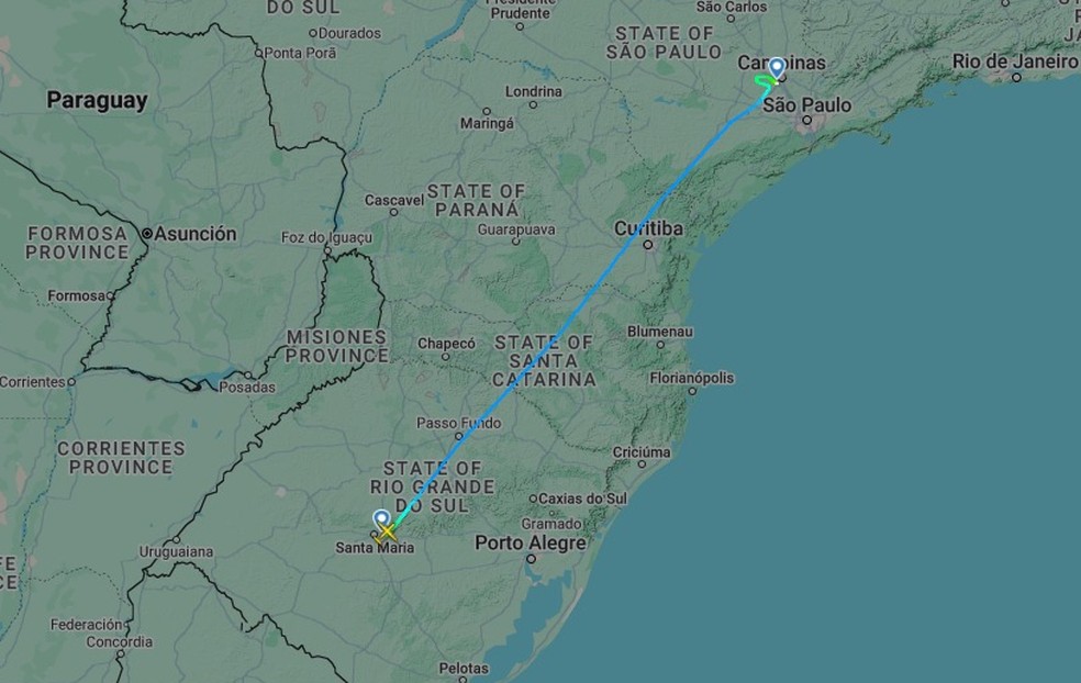 | Itinerário de voo atrasado duas horas após passageiro tentar abrir saída de emergência no RS (Imagem: Reprodução/Flight Radar) |