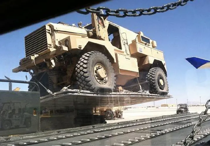 No Camp Bastion, o pessoal do NAC amarrou cada MRAP a um palete duplo usando correntes e colocou escoras sob as rodas para distribuir a carga de maneira mais uniforme e evitar exceder a capacidade estrutural do piso do compartimento de carga.