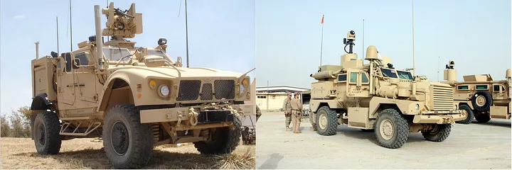 | Esquerda: um Oshkosh M-ATV (usuário PEOSoldier do Wikimedia); Direita: um Cougar (imagem de domínio público). |