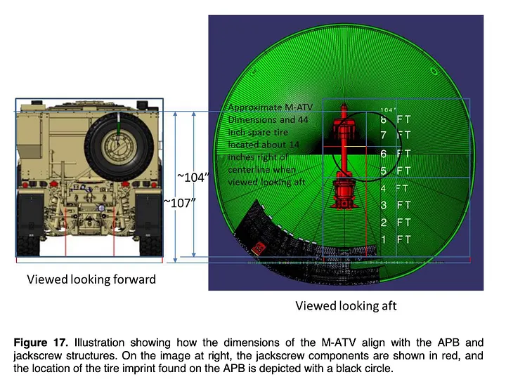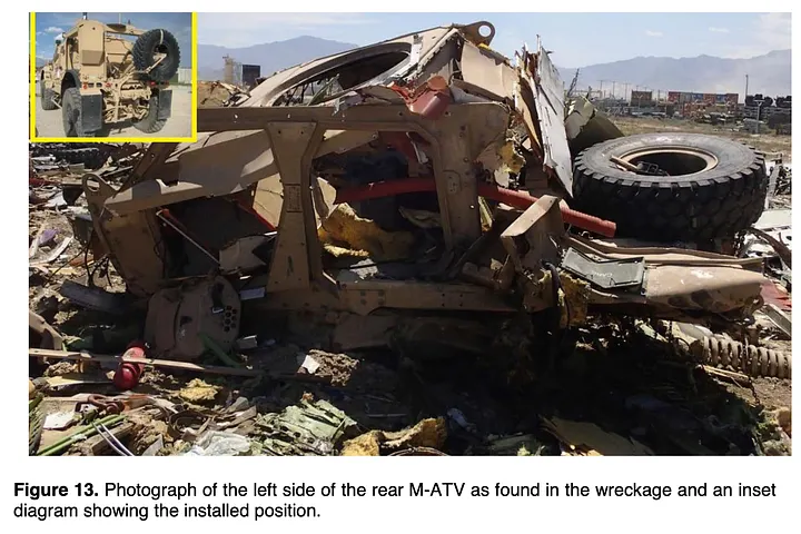 No próprio local do acidente, a antepara de pressão traseira foi encontrada quebrada em vários pedaços, mas quando remontada, mostrou uma marca de impacto circular clara que se alinhou perfeitamente com a localização do pneu sobressalente montado na parte traseira do M-ATV mais traseiro. Essa marca só poderia ter sido feita pelo M-ATV rolando para trás na decolagem, porque o impacto da queda subsequente foi em grande parte vertical e teria lançado o M-ATV contra o teto, não contra a antepara.