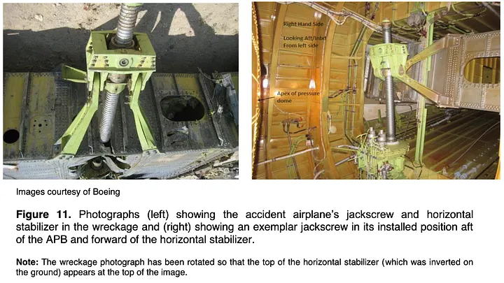 Além de todas essas evidências, o parafuso de macaco que controla o estabilizador horizontal também forneceu pistas reveladoras. O enorme parafuso havia sido cortado para trás, alguns centímetros acima do motor de tração, um modo de falha inconsistente com as forças principalmente verticais envolvidas no impacto final. A posição do parafuso de macaco era tal que teria sido atingido pelo pneu sobressalente do M-ATV após passar pela antepara de pressão traseira, indicando fortemente que foi isso que causou sua quebra.