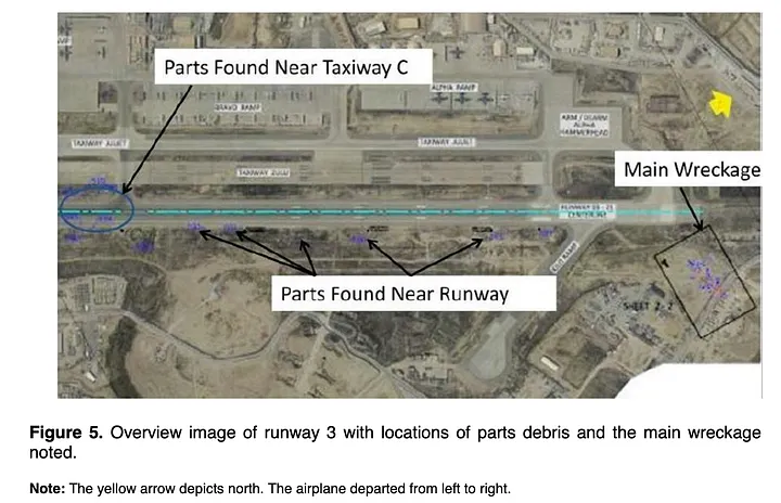 | Visão geral do local do acidente, com a localização dos fragmentos da antepara de pressão traseira identificados (NTSB) |