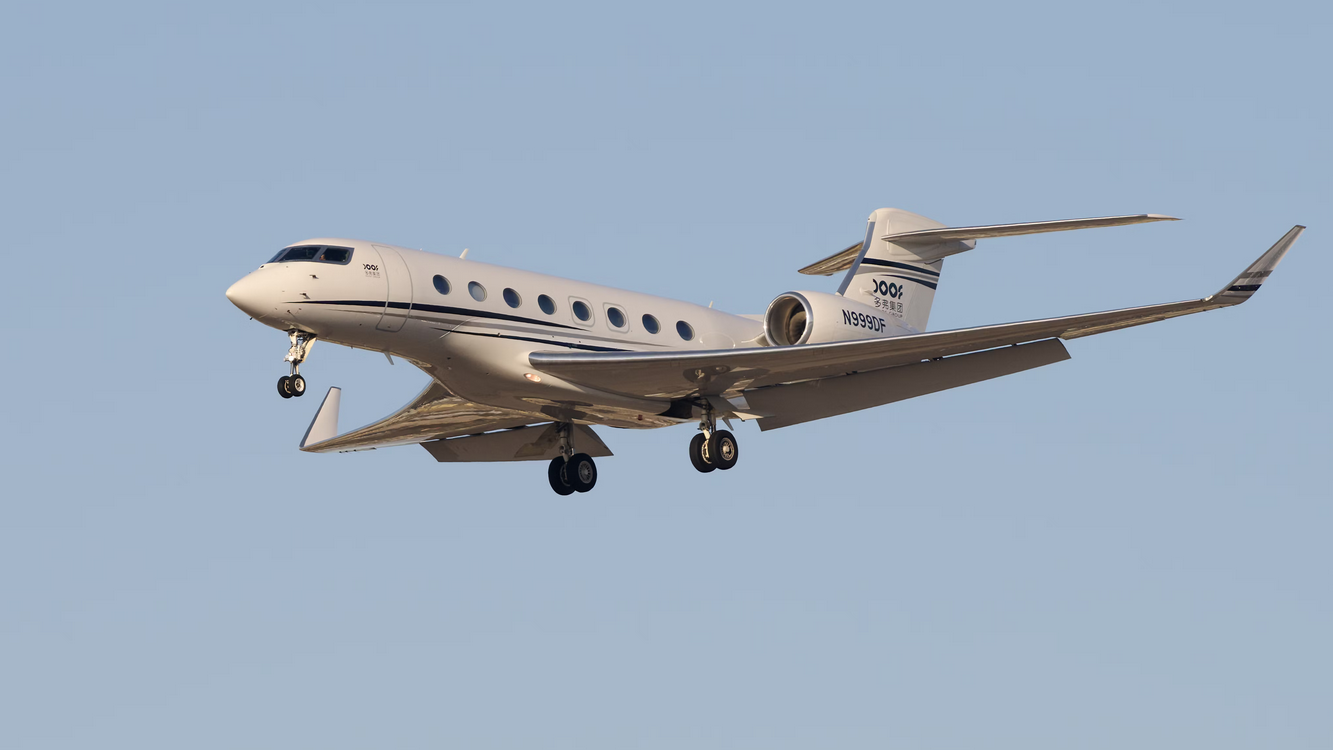 Um jato particular Gulfstream G650ER momentos antes de pousar no