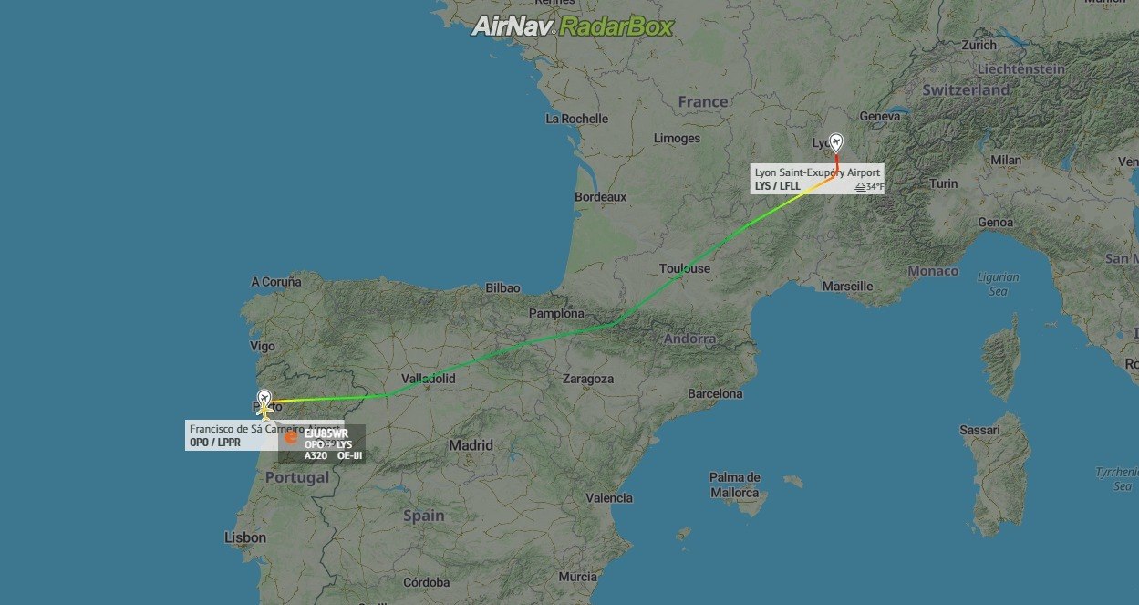 O voo entre Lyon e Porto tem duração de cerca de 1 hora e 50 minutos, de acordo com a plataforma RadarBox.com.
