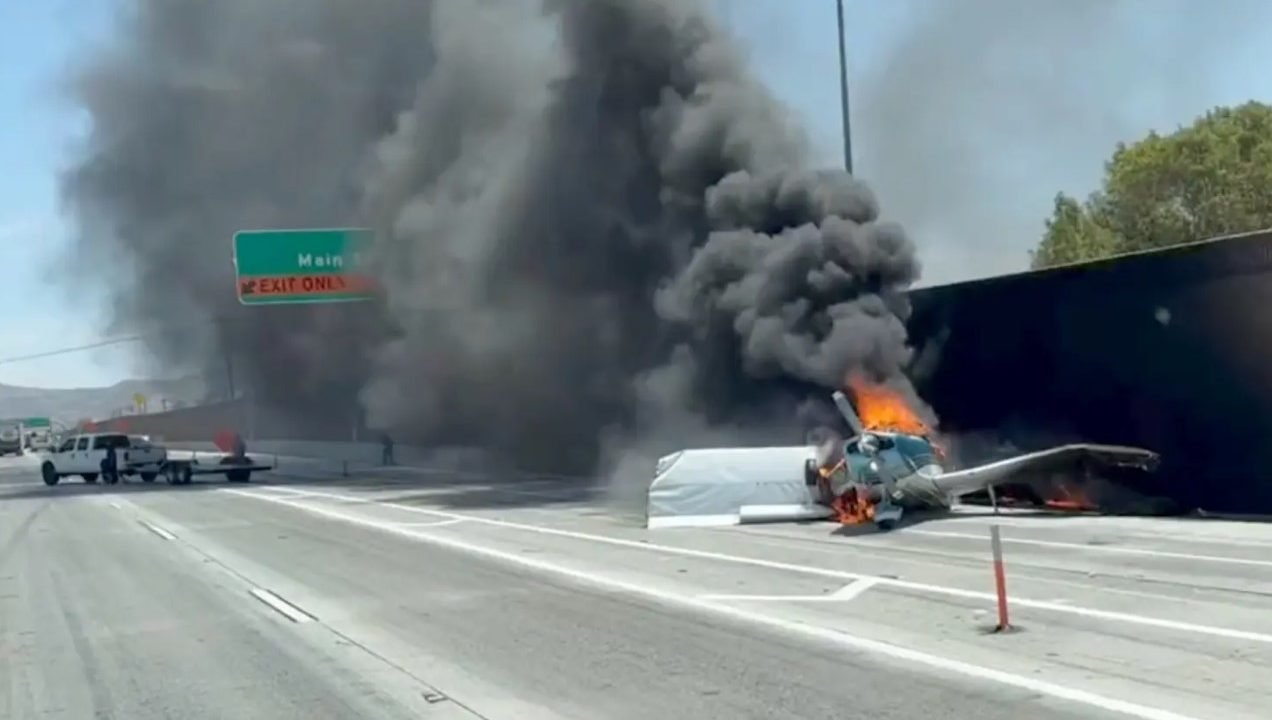 Um pequeno avião fez um dramático pouso forçado em uma rodovia da Califórnia, nos Estados Unidos, nesta terça-feira (9), atingindo um caminhão antes de explodir em chamas.