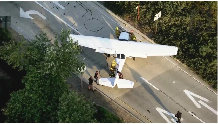 O avião de pequeno porte Cessna 172M Skyhawk, prefixo N1399U, do OC 172 Group, pousou no meio de uma estrada (101 Freeway) em Westlake Village, próxima ao aeroporto Van Nuys, em Los Angeles, na Califórnia, nos Estados Unidos, na segunda-feira (31), interrompendo o tráfego enquanto os motoristas voltavam para casa no final do fim de semana do Memorial Day.