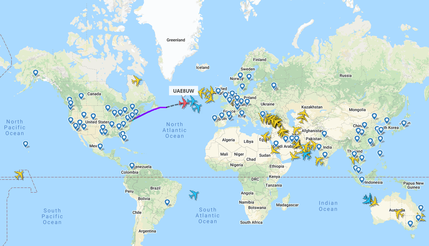 A imagem acima mostra quase todos os A380 no ar em 5 de maio de 2022. Em destaque está o EK202, indo de JFK para Dubai. Seu indicativo de chamada era 'Emirates Eight Uniform Whiskey', e ele havia partido do Aeroporto JFK à 00h11.