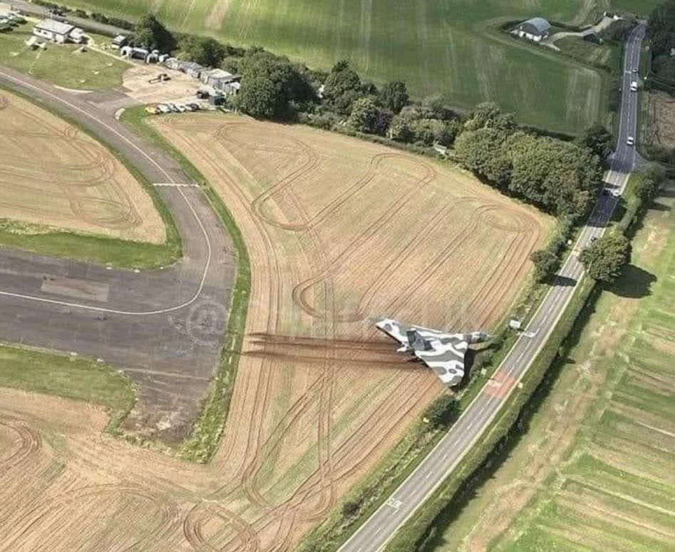 Oops. Vulcan bomber at Wellesbourne airfield has just overshot the runway during a hot taxi run. Almost made it to the road. pic.twitter.com/CMoIFSIinp