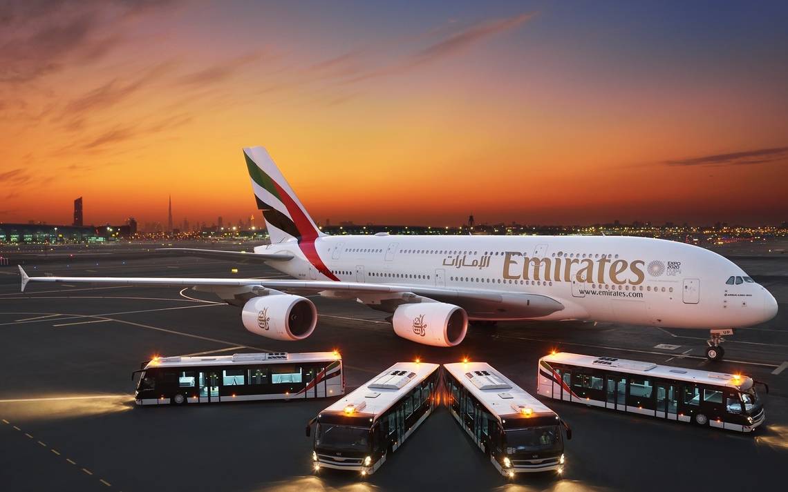Um A380 da Emirates estacionado perto de quatro ônibus da empresa aérea (Foto: Emirates) |