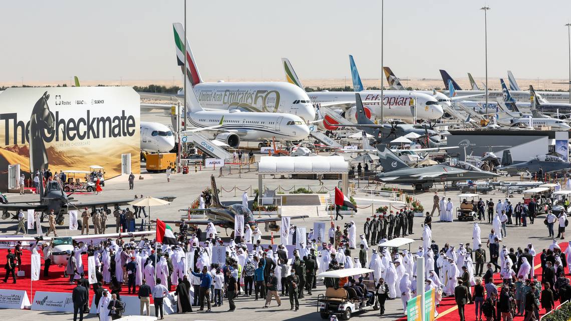 | Centenas de pessoas e diversas aeronaves no Dubai Airshow (Foto: Dubai Airshow) |