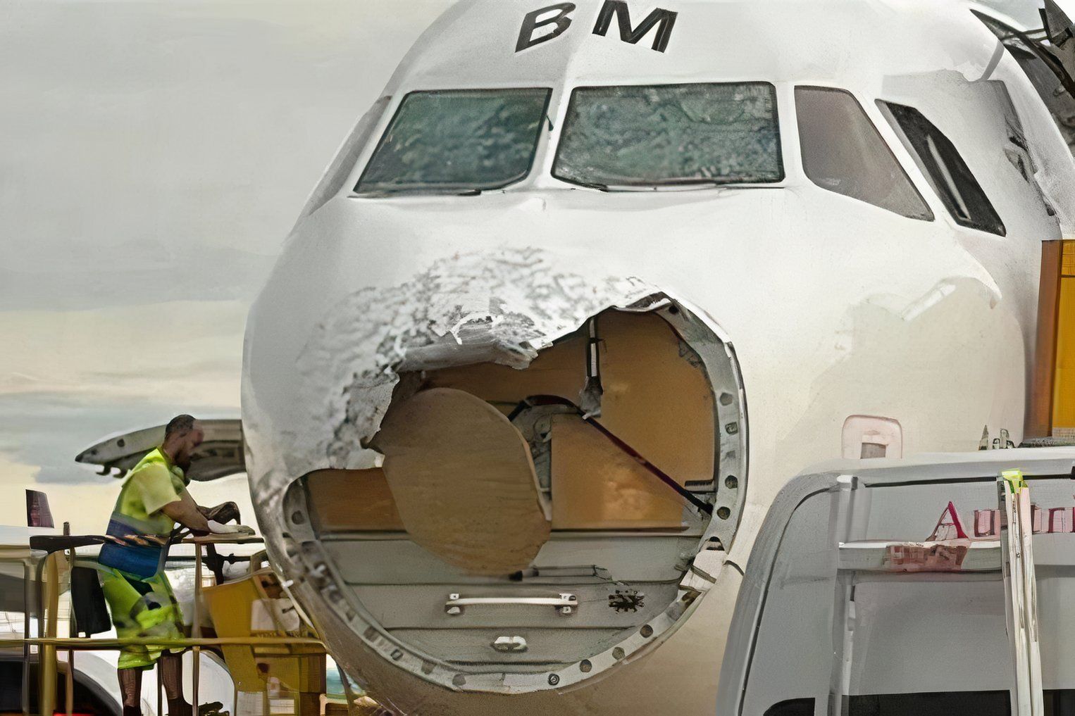 Como um passageiro disse mais tarde à BBC: “O voo ficou super agitado, e podíamos sentir o granizo batendo no avião. Várias pessoas gritaram. Vi pedaços de alguma coisa pela janela, mas só quando saímos do avião é que percebi o que era. A frente inteira do avião estava destruída. Eram partes do cone do nariz que eu vi voando.”