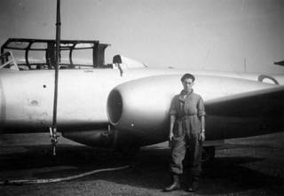 Ele descreveu como eles trabalharam em Gloucester Meteors de um e dois assentos. Naquela época e lugar, a RAF estava trabalhando nos modelos Meteor F.4 e T.7. Michael está retratado abaixo, de pé ao lado da variante de treinamento Meteor de dois assentos, o T.7.