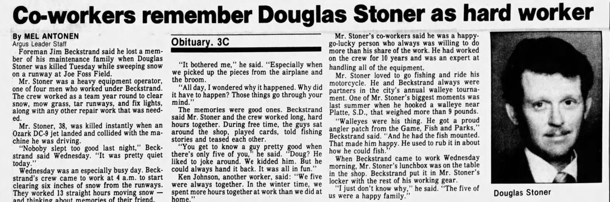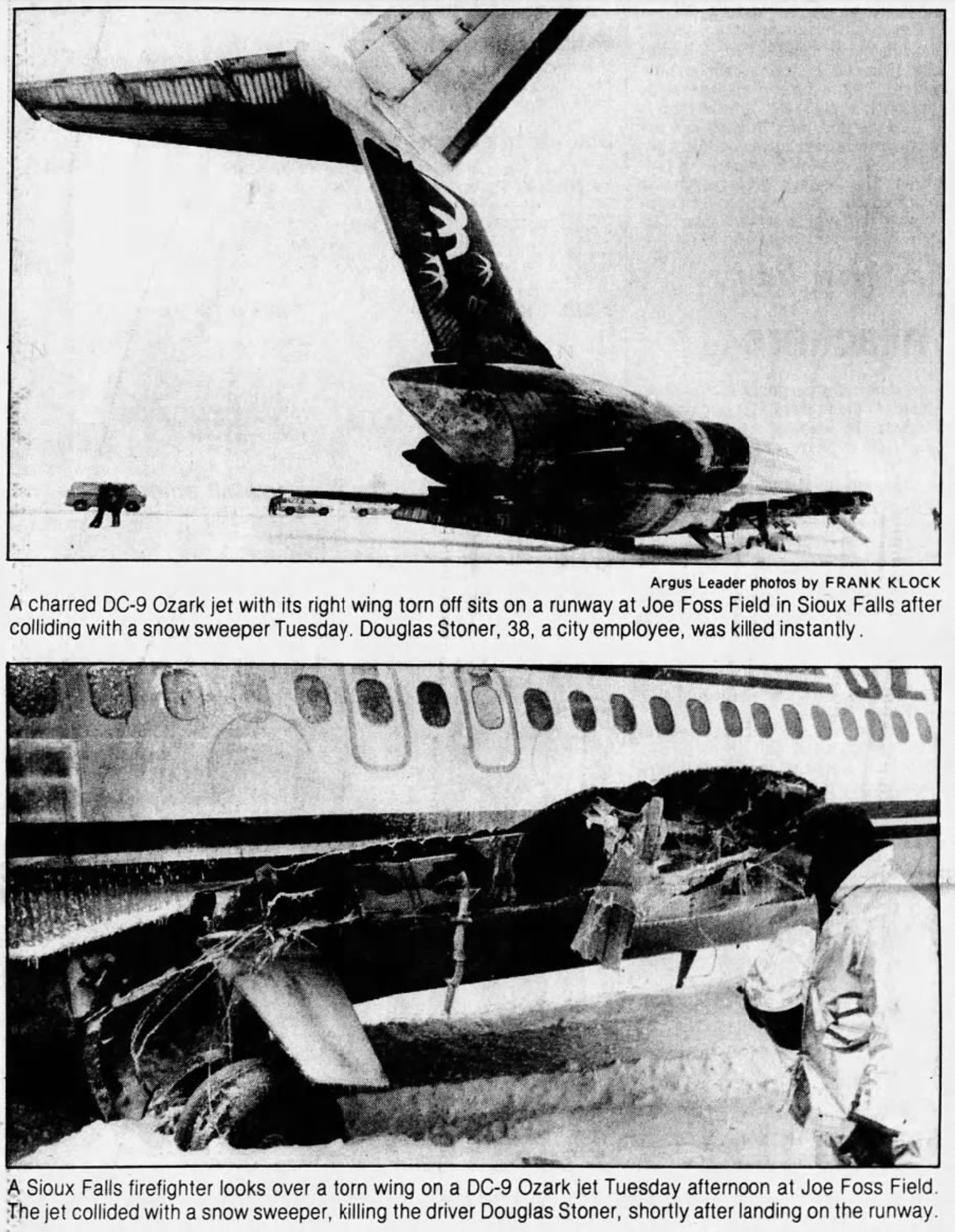 A asa direita do DC-9 atingiu um grande veículo varredor de neve na pista. O impacto arrancou a asa direita do avião, destruindo o limpa-neves e matando seu motorista, Douglas Stoner, de 38 anos.