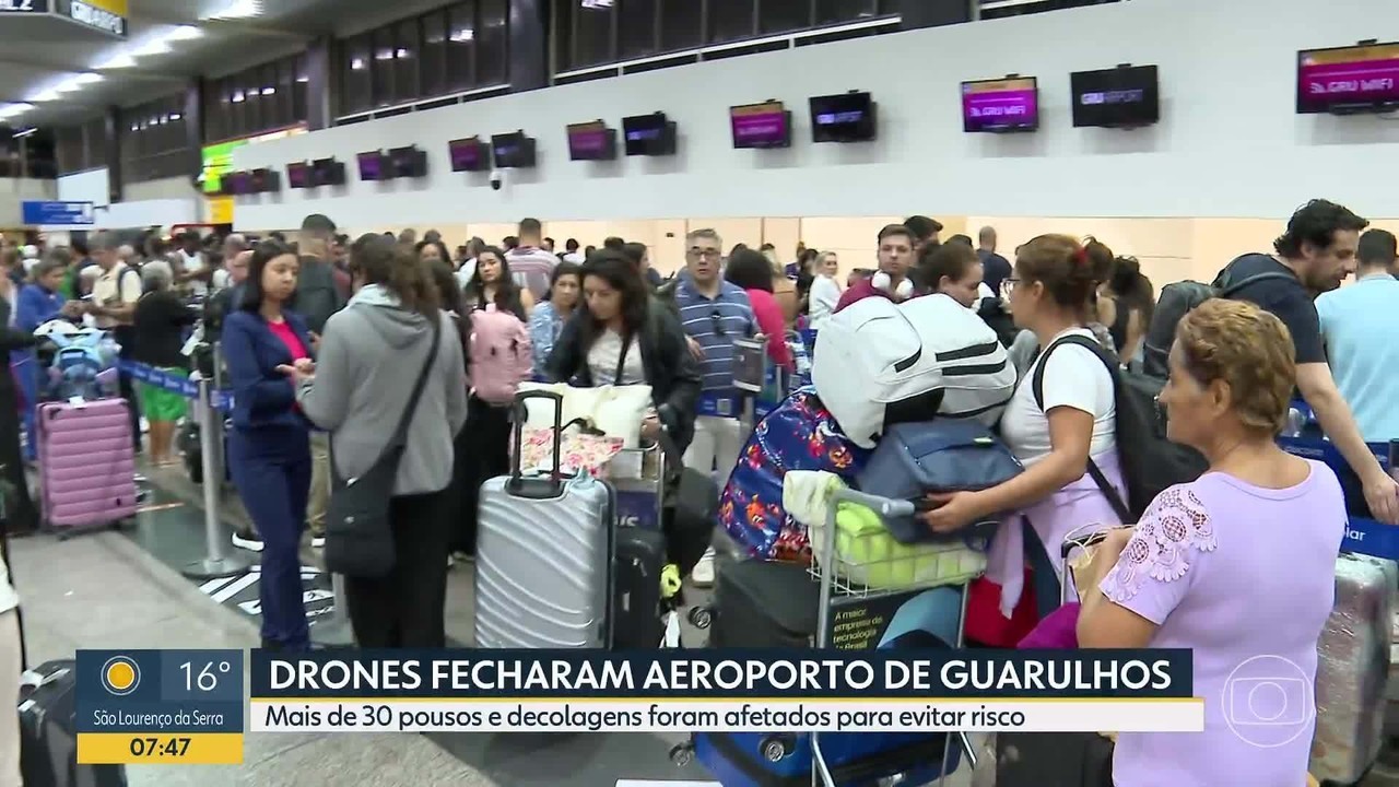 A Agência Nacional de Aviação Civil (Anac) informou que registrou o fechamento do Aeroporto Internacional de Guarulhos por três horas, por conta de voos de drones nas proximidades do aeródromo. Como consequência, houve 32 voos alternados – direcionados para outros aeroportos – e oito voos cancelados.