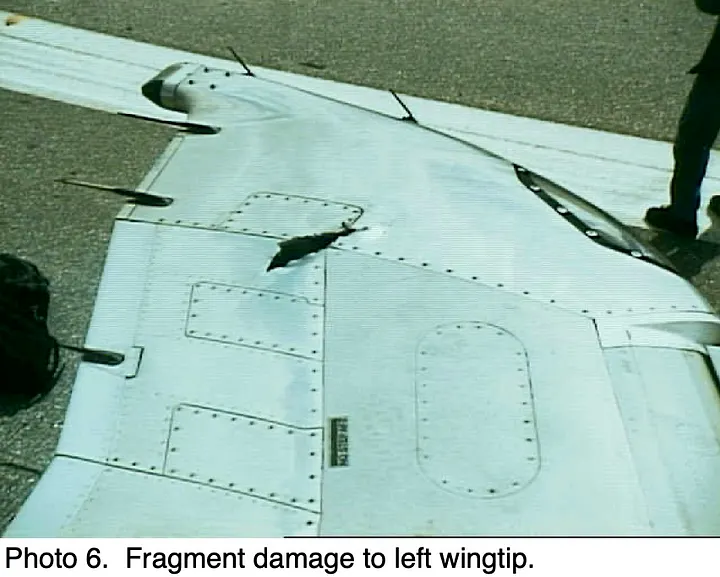 Um fragmento penetrou na ponta da asa esquerda (NTSB)