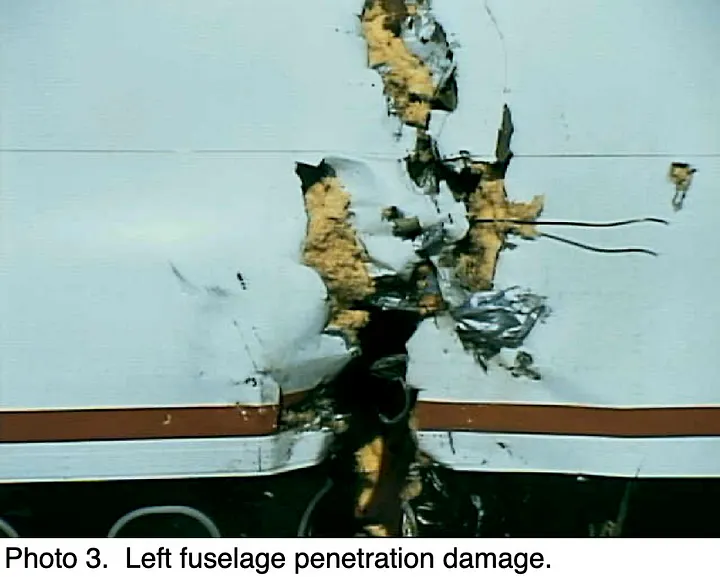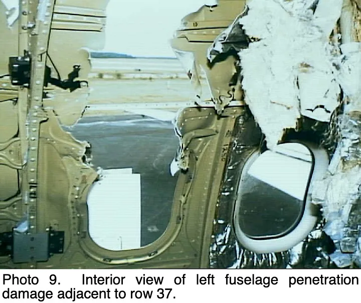 Mais ao fundo, algo muito mais material atravessou a cabine de passageiros. Num piscar de olhos, a parede lateral esquerda da cabine, alinhada com a fileira 37, explodiu em uma chuva de metal, plástico e isolamento, atingindo a traseira da aeronave com detritos, antes que o que quer que tenha causado a explosão saísse pelo outro lado, deixando vários buracos na parte superior direita da fuselagem, acima dos compartimentos superiores.
